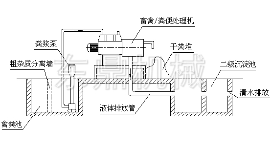 用設備配套的無堵塞液下泵將牛糞水抽送至牛糞固液分離機內,再由絞龍將牛糞水逐漸推向機器的前方,同時不斷提高機器前緣的壓力,迫使物料中的水分在邊壓帶 濾的作用下擠出網篩,流出排水管。牛糞固液分離機的工作是連續進行的,其牛糞水不斷的提升至牛糞固液分離機體內,前緣的壓力不斷增大,當大到一定程度時, 就將出料口頂開并擠出擠壓口,達到擠壓出料的目的。為了掌握出料的速度與含水量, 可以調節主機下方的配重塊,以達到適當的出料狀態。如果抽入牛糞水過多,會經溢液管排到原牛糞水池,經螺旋擠壓過濾分離出的牛糞廢水可直接派送至沼氣 池發酵沼氣或排送至其廢水沉淀池等。